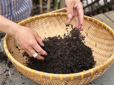 最后一道工序就是干燥。发酵好的发酵叶要先晒两个太阳,再放进烘焙箱里烘,温度根据经验控制在90℃左右,烘上1个小时。如果觉得干燥度不够,可以隔半个月左右再烘一次。