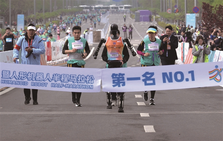 备受关注的世界首次“人机共跑”半程马拉松赛事19日在京完赛。来自北京人形机器人创新中心的“天工队”以2小时40分42秒的成绩摘得冠军,“松延动力小顽童队”和“行者二号队”分获亚军、季军。