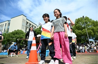 三、四年级的?两人三足接力赛?将运动会推向高潮。学生们两两结对,从跌跌撞撞到步伐统一,从手忙脚乱到巧妙配合。欢呼声与欢笑声此起彼伏,见证着团队协作的无限可能。