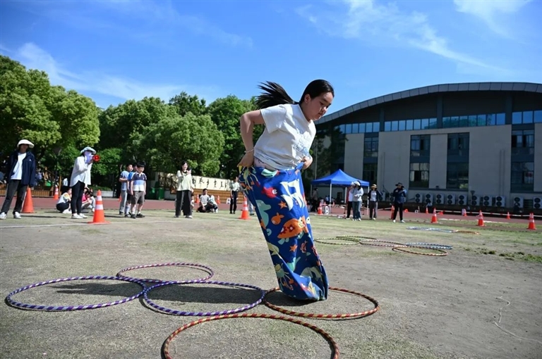 五、六年级的“袋鼠勇士”们在?跳圈接力赛?中火力全开。学生们套上布袋,化身蹦跳的“小袋鼠”,在圈与圈之间灵活穿梭。赛道旁“加油,别踩线”的呐喊声,与选手们认真又逗趣的表情,交织成运动会的欢乐乐章。