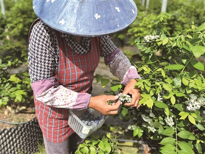 记者现场品尝了一颗成熟蓝莓,果皮薄脆,汁液清甜,果香浓郁。“蓝莓对生长环境要求较高,适宜在15℃—25℃环境下生长。”蒋张明介绍起蓝莓种植的“秘诀”,“我们采用控根基质栽培,配合肥水一体化技术实现肥水精准调控。同时,我们坚持绿色种植理念,使用有机肥和高钾型水溶肥等绿色肥料,并全园覆盖园艺地布防草,保障蓝莓的品质与产量。”据他测算,今年基地蓝莓亩产预计可达五六百斤。
