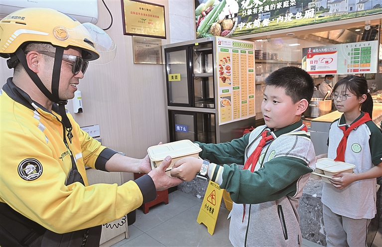 “五一”国际劳动节来临之际,城厢街道燕子河社区联合育才小学在“歇会儿吧”点位施家八大碗助老餐厅,开展“致敬劳动者”主题活动。学生们将自己种植的蔬菜制成暖心餐食,赠送给外卖骑手、环卫工人等一线劳动者,感谢这些“城市守护者”的辛勤付出。