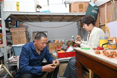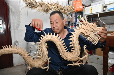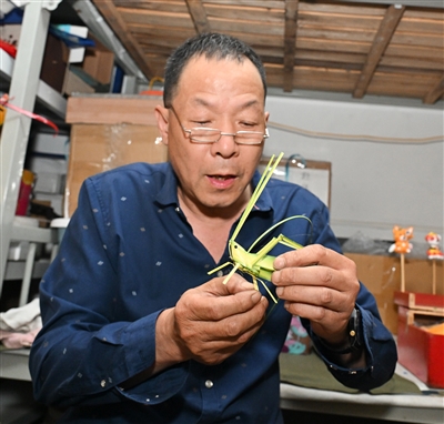 临浦镇临水苑,非遗传承人王保国简陋的工作间里,一片片棕叶在他指尖翻飞,片刻间化作振翅的蚱蜢、盘旋的苍龙。