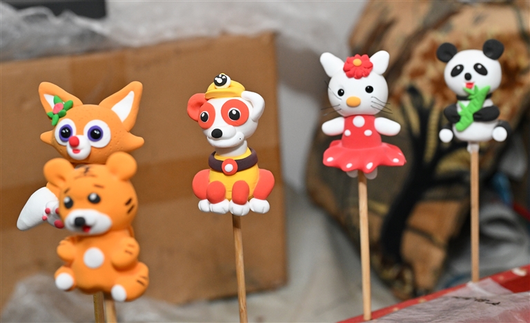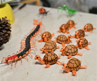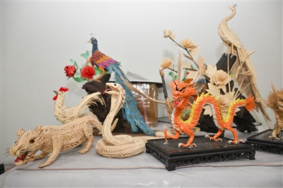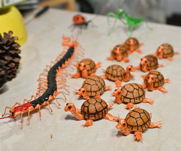 经数十年摸索,他独创“多脊反扣锁折法”“龙鳍编法”等绝技,更以红豆点睛、铁丝塑形等技法让作品形神兼备,达到以假乱真的境界。为突破传统手艺式微的困境,王保国大胆革新:将棕编与现代饰品融合,推出胸针、耳环等文创产品。 他的作品历经数十年仍完好如初,秘诀在于选材严苛——仅用老棕叶或叶芯,经沸水煮、日晒夜露等工序定型,方能历久弥新。 “手艺不能断代。”王保国常年奔走于社区、学校,手把手传授技法。家中局促的空间让他心怀愿景:“大型作品只能封存箱底,若能有间工作室,定要复原丝绸之路的场景,妻子的面塑作品也可共同展出。”谈及收徒,他直言:“最好是临浦本地人,耐得住寂寞,肯下笨功夫。”