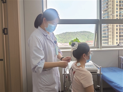 在采访中,记者遇到了刚工作一年的职场新人小许。采访当天,小许接受的是颈部电疗。这是一种物理治疗方法,通过利用不同的电流以及电磁场来治疗疾病。每次电疗时长20分钟,两个贴片贴在肩颈部,通过低频电流刺激神经末梢,能够有效缓解颈椎周围的肌肉紧张和痉挛,从而减少疼痛感。