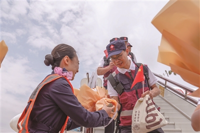 图为5月18日,工作人员在昆明长水国际机场为中国政府援缅卫生防疫队队员献花。