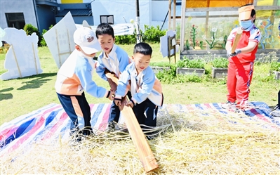 “哇,油菜长得比我还要高!”孩子们踮起脚,用稚嫩的手指丈量着茎秆的高度。园长何红燕轻声细语地讲述着油菜籽的故事,孩子们立即竖起耳朵。原本传统的农事活动,就这样变成了妙趣横生的探究课堂:孩子们自主成立“工具博物馆”,从木槌、筛子到小推车,每一样工具都是解决问题的“钥匙”。割油菜时,他们小心翼翼地握住镰刀,模仿着大人的模样,轻轻一割,油菜籽便应声而落;打油菜籽时,他们又聆听到“用力压,荚果会唱歌”;而在筛油菜籽时,他们则发现“筛子斜一点,菜籽跳舞更欢快”。“劳动是最真实的课堂,孩子们在泥土里学会了观察、合作,更学会了创造。”园长妈妈欣慰地说道。