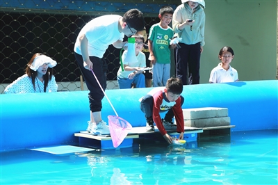 三四年级的学生带来了用废旧材料制作的动力小船:有的用塑料瓶做船体,有的用泡沫板搭建船身。随着裁判一声令下,小船们或直线前进,或灵活偏转,展现出了学生们的创意与智慧。
