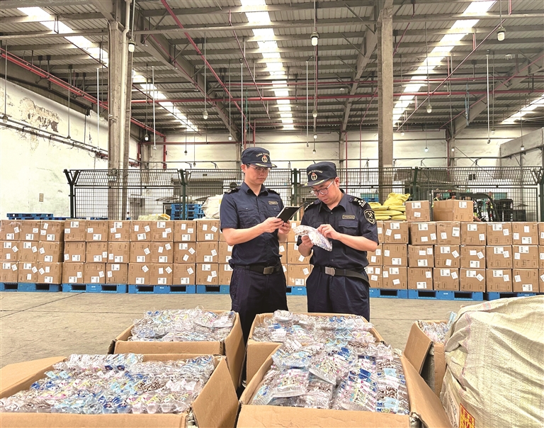 近日,杭州萧山机场海关关员在对一批出口发夹、仿首饰的查验过程中,发现部分塑料发夹上使用与“Labubu”系列产品高度相似的图案。现场初步判断该批发夹涉嫌侵权。