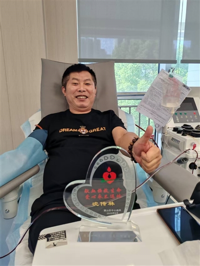8月8日,是他60周岁的生日,生日前一天他又一次来到了区献血服务中心成功捐献了300毫升成分血。自2012年起,沈传林连续13年参与献血193次,献血总量超57000毫升(含成分血),相当于14个成年人全身血液的总和,可能帮助超300名病患。