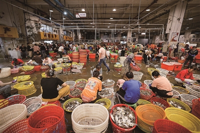 近日,东海部分海域结束为期3个月的伏季休渔期,浙江舟山市申请了专项捕捞特许的渔船结束休渔,开赴东海海域进行捕捞作业。舟山沈家门渔港舟山国际水产城的商户们迎来了忙碌的时节,近期每天约有2000吨梭子蟹到港,经过分拣、绑扎后发往各地市场。