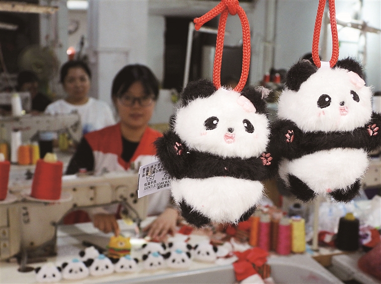 图为8月11日,在四川省达州市达川区景市镇红岩洞村诚兴外贸玩具加工厂,工人赶制出口欧美国家的包挂。