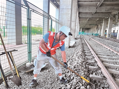 “第一步是要对石渣饱满程度进行修补。”徐金祥解释,“先用大拉耙将石砟从轨道间清出,在两侧垒成整齐的‘田埂’,再用四齿钉耙仔细修整,压实枕木下的石砟。这能提高轨道稳定性,减少列车振动。”