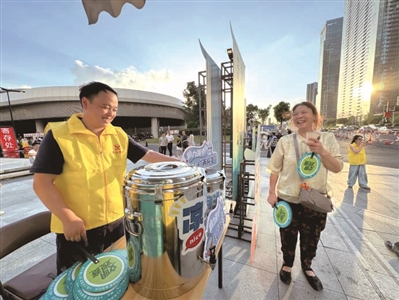 地铁博览中心站B2口的文明观赛加油站前,利丰社区搭起了临时茶水铺,胖大海茶与凉茶整齐排列,身穿马甲的“00后”小高为观众递上印有文明观赛标语的扇子,送上凉茶。“这口凉茶下肚,感觉暑气都消了大半!” 前来观赛的黄女士连连称赞。