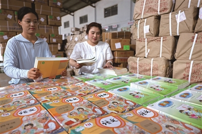 图为8月14日,在山东省枣庄市新华书店教材发行中心,工作人员在清点整理新学期教材。