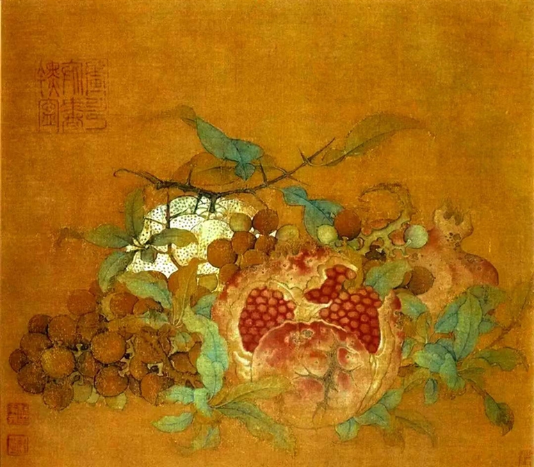 波士顿美术馆藏的南宋鲁宗贵《吉祥多子图》,将橘子、葡萄、石榴三种象征吉祥的水果堆叠于画面中央。这幅作品虽为静物写生,却通过物象的选择与组合,传递出深厚的文化内涵。在中国传统中,石榴因籽多而被赋予“多子多孙”的寓意,葡萄亦象征子孙繁衍,“橘”与“吉”谐音则代表吉祥。鲁宗贵将这三种水果并置,不仅构成色彩与形态的对比,更通过物象的叠加强化了吉祥的主题。画面中,石榴裂开的果皮露出饱满的籽粒,葡萄串如珠玉垂落,橘子圆润如金,三者共同构建出一个丰饶的视觉场域,隐喻着家族的繁荣与幸福。这种以物喻人的手法,体现了南宋宫廷绘画对伦理教化的重视——通过艺术作品传递社会价值观,强化家族与国家的联系。