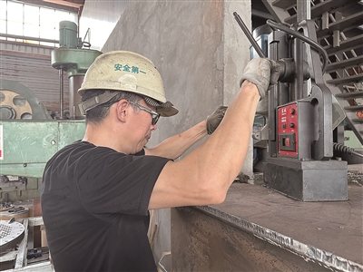 这几天,浙江力久环境科技有限公司的机工陈建江就用这个机器给公司自研的新型大口径预反应器进行打孔,“我这道工序是来固定预反应器的驱动箱,算是起一个承上启下的作用。前面,有工人会在激光切割机上把材料下掉,我打完孔后,其他工人再进行组装。”