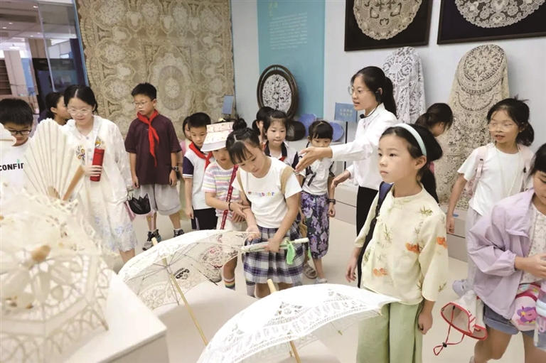 他们穿梭在各个展厅,好奇地观察着花边、剪纸等展品,听着非遗传承人的故事,眼中满是惊叹。
