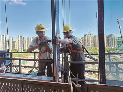 抬眼望去,幕墙安装工人们如同“蜘蛛侠”般“悬”在楼宇外侧焊接窗框,黄色的安全帽、橘红色的安全带,在烈日与灰色建筑的映衬下,格外显眼。