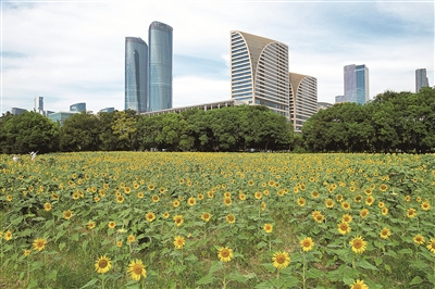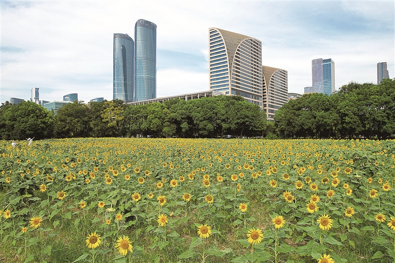 钱江世纪城杭博中心附近的向日葵已绚烂绽放,形成一片金色花海,吸引了众多市民和游客前去打卡拍照。