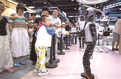 昨日,2025年中国国际服务贸易交易会在北京落下帷幕。图为昨日,小朋友在服贸会的主题展上与人形机器人互动。