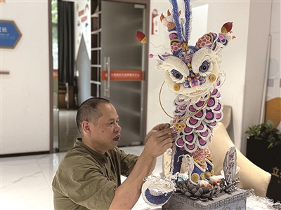 舞狮一只爪子踏在莲花上,身姿轻盈,仿佛随时要舞动。这也是甘海水首次尝试创作“有脚”的舞狮。“腿这么细,头又这么重,怎么立得住?”面对记者的疑问,甘海水笑着说:“里面有钢筋做骨架,没有支撑点是站不稳的。”他先搭建好骨架,再塑舞狮的身子、腿和头,最后一片片贴上鳞片。
