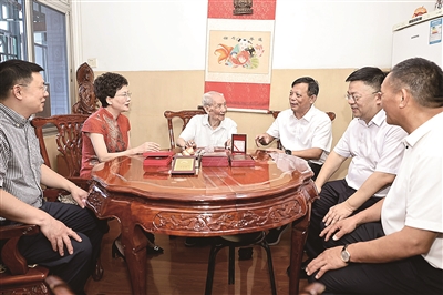 随后,慰问组前往某康复医院看望97岁的抗战老兵马保山。马老1944年投身革命工作,先后在山东苍山任区委文书、组织委员、武工队长、民兵担架营教导员等职。他是首批南下萧山的干部,担任过萧山县委农工部副部长、县委宣传部副部长、县委党校校长、县农业局副局长、五七学校校长等;1978年7月起任萧山检察院检察长、县委候补委员,1992年12月离休。