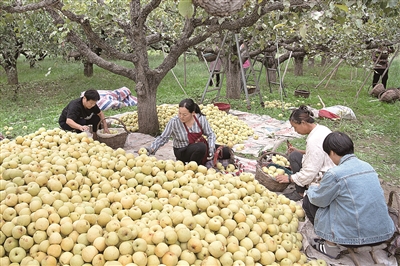 图为9月18日,在安徽省宿州市砀山县一处梨园内,梨农在分拣酥梨。