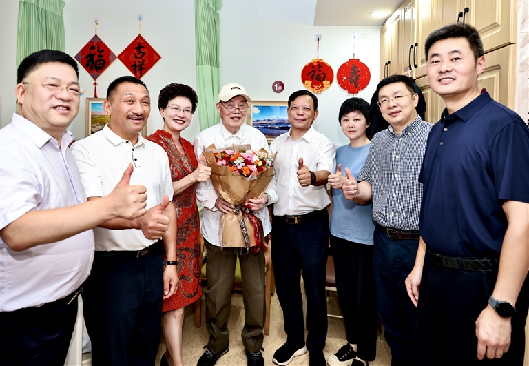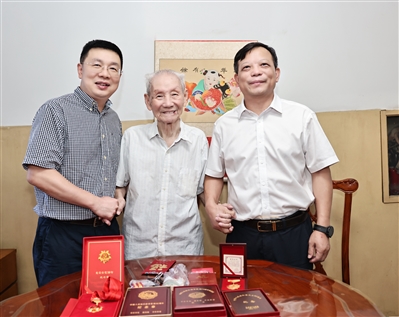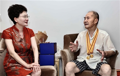 慰问组首先向陈老献上节日祝福,并关切他的身体和生活情况。看到陈老精心保存的中国人民抗日战争胜利80周年纪念章,慰问组负责人赵青询问:“您看了今年九三阅兵式吗?您有什么感想?”