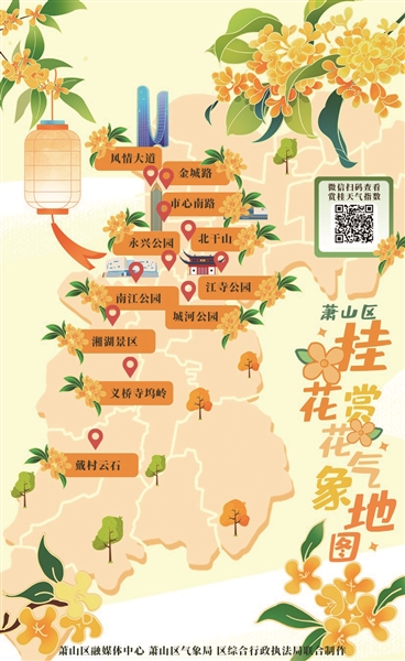 为了方便市民朋友们赏花,区气象局、区综合行政执法局、区融媒体中心联合推出《萧山桂花赏花气象地图》,带你解锁全区最佳赏花点位以及各点位的气象赏花指数。从眉山路到跨湖桥,从北干山到寺坞岭,赏秋光,嗅秋香,任香气、诗句、禅意、世情兜满衣袂。