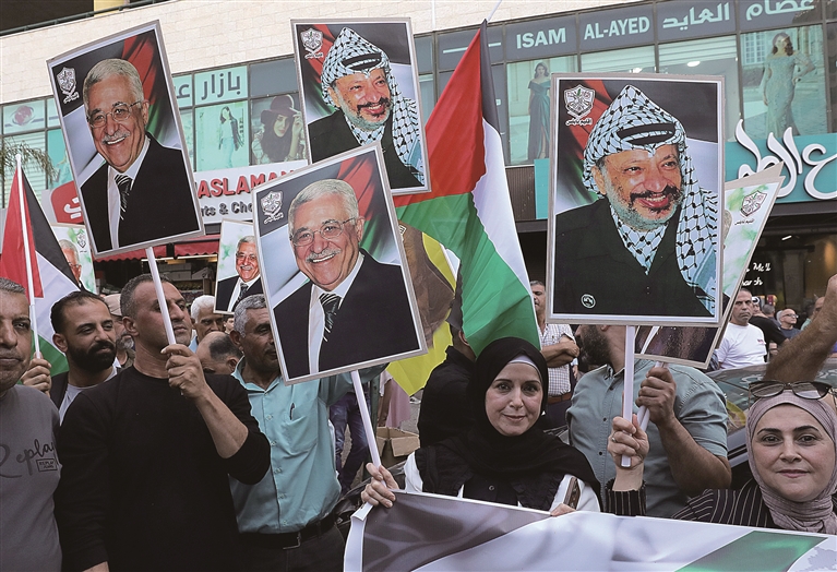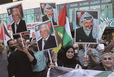 9月23日,巴勒斯坦约旦河西岸多个城市举行集会和游行活动,庆祝多国承认巴勒斯坦国,同时继续声援加沙地带民众。图为9月23日,在约旦河西岸城市纳布卢斯,民众挥舞巴勒斯坦领导人阿拉法特和阿巴斯画像参加庆祝活动。