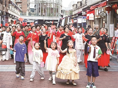 近日,城厢街道东白马湖社区举办“月满华诞之乐享街趣”双节快闪活动。五大社团现身金湖商业街头,带来合唱、太极等表演;现场设月饼制作、猜灯谜等互动,青缘公社助力交友,平安驿还通过问答普及安全知识,让居民乐享佳节。