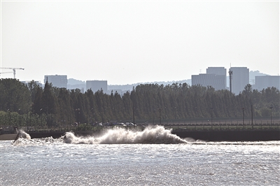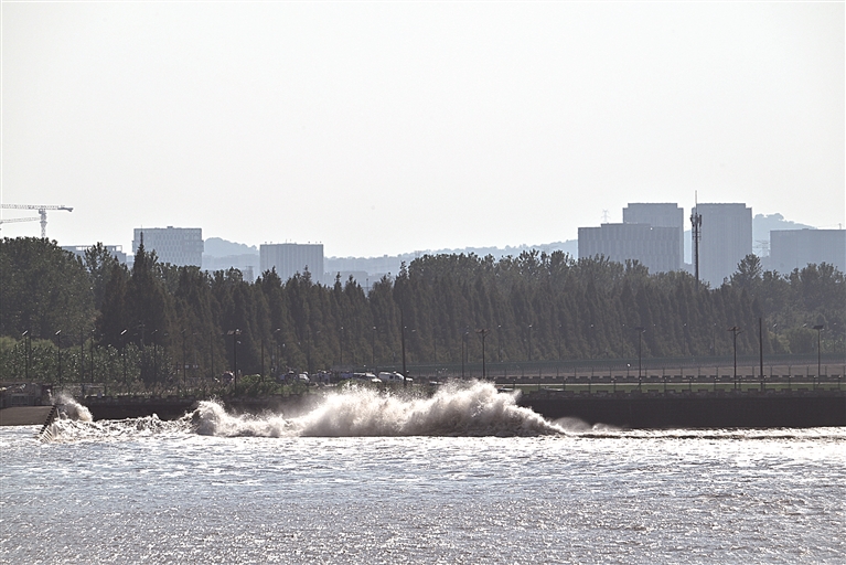 昨天正值农历八月十八,下午两点三十分左右,滚滚的钱塘江大潮奔涌至南阳美女坝,猛烈撞击堤坝后,掀起壮观的回头潮。