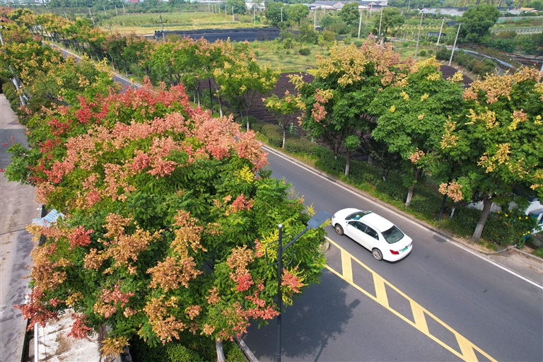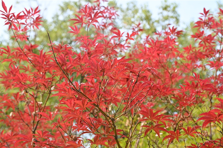 漫步山野,鸡爪槭的叶子已渐渐变红,像是被秋意点燃的火焰,在枝头跳跃闪烁;黄山栾树也不甘示弱,红的、黄的的果实挂满枝头,宛如一串串小巧的风铃,在微风中轻轻摇曳;榉树叶正经历着一场华丽的变身,由绿渐黄,似是被大自然用画笔轻轻勾勒,晕染出层次丰富的色彩;地面上的阔叶麦冬开出一串串紫色的花,星星点点散落于草丛间,如灵动的眼眸。