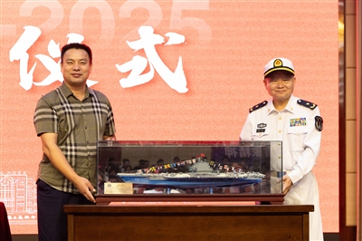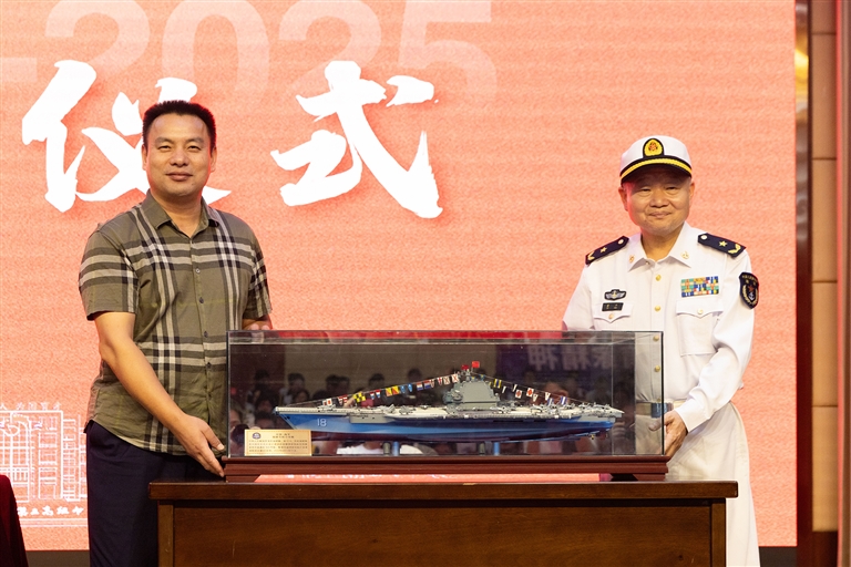 此次论坛活动中,夏平将军还向母校捐赠了一艘福建舰航母模型,萧山三中党委书记徐文太代表学校郑重地接过这份厚礼,并将其陈列于校史馆,作为红色教育的生动教材。