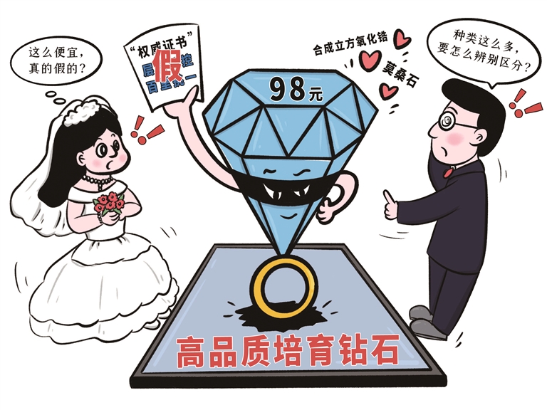 近日,电商平台及直播间涌现大量标价一两百元的“培育钻石”。调查发现,这些低价“钻石”实为“莫桑石”或“合成立方氧化锆”,成本不足培育钻石的1%,附带的“证书”几元即可购得,有误导消费者之嫌。消费者需提高警惕,留存凭证,遇问题及时通过平台或监管部门维权。