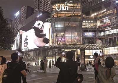 近日,成都高新区交子大道上的裸眼3D数字熊猫上了全新动效,一只裸眼3D数字熊猫灵巧地“爬上”建筑外墙,不时“转头看向”围观人群,最后悠闲地“坐下”,吸引了众多市民游客来此打卡。