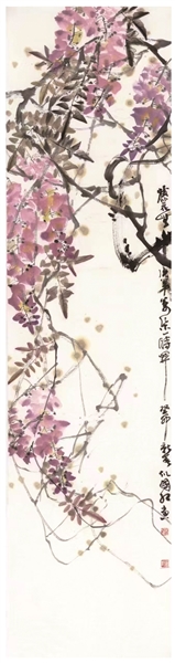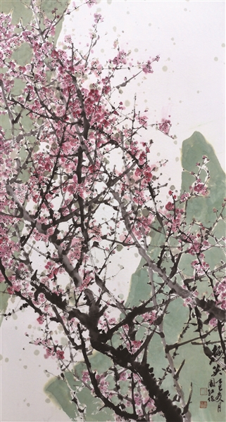 这幅作品中,梅枝以浓淡干湿的墨色表现,线条苍劲有力;梅花以粉、红等色点染,层次丰富,既显繁花盛景的蓬勃生机,又体现了传统花鸟画的笔墨韵味。构图疏密有致,背景淡绿色山石与梅花形成色彩对比,清雅而不失张力。