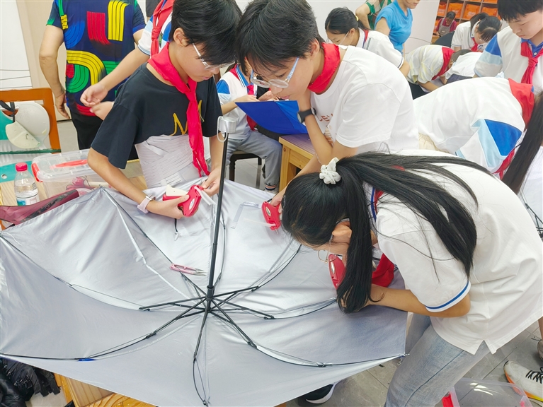 活动的高潮莫过于现场制伞、叠伞的体验环节。三所学校的学生代表混合组队,在工坊师傅的指导下亲手参与制伞。这不仅是对动手能力的挑战,更是对团队协作精神的考验。当一把把凝聚着集体智慧的伞具在手中成型,孩子们的脸上洋溢着自豪与喜悦,校际之间的友谊也在合作中得到了升华。