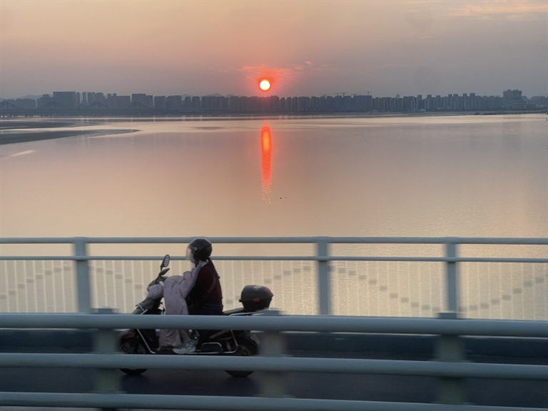 | @杨柳菁菁 残阳伴我下班路 一道残阳铺水中,半江瑟瑟半江红。我称之为今年夏季最后的夕阳。 |
