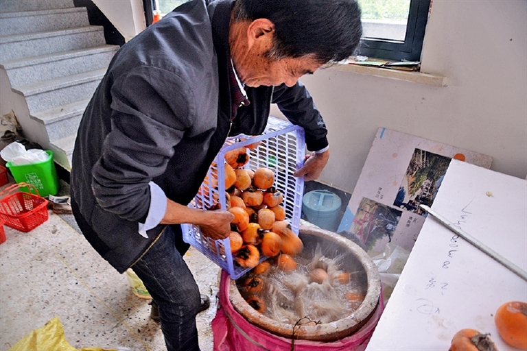 | @傅灿良 炝柿子 按100斤柿子配8斤左右生石灰的比例,把石灰放入65℃左右的温水里,搅拌好石灰水后,把柿子放进去,刚没过顶就可以,浸泡24小时后,柿子就能捞出来吃了。图为临浦镇横一村村民在炝柿子。 |