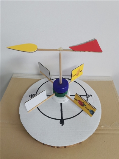 | @燕燕姐小陈 风向标小手工 一个坚果外包装盒、两个瓶盖、一根吸管、两根竹签、一把胶枪、一把剪刀,风向标就做好了。再晒一晒我画的字儿,照着手机里的艺术字画的,看起来还不错呢! |