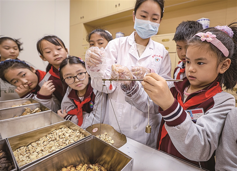 图为10月22日,在山东省荣成市中医院中医药科普馆,学生学习称量中药材。