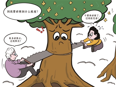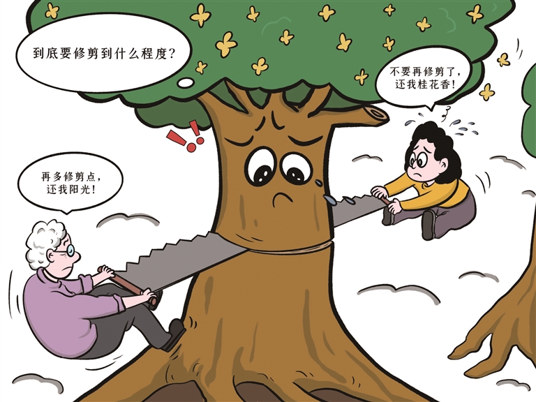 近日,杭州一小区居民因桂花树修剪引发矛盾。这棵长了二十多年的桂花树,如今已高过四五层楼,低层住户抱怨遮光生虫,可工人一动手,又有居民心疼“砍得太秃”。老树该修,但不能乱修,既要有专业人科学修剪,也要多听居民意见,在满足居民合理需求与保护绿化景观间寻求平衡,让桂花香和邻里情一起留在秋风里。