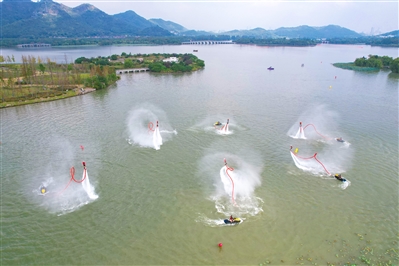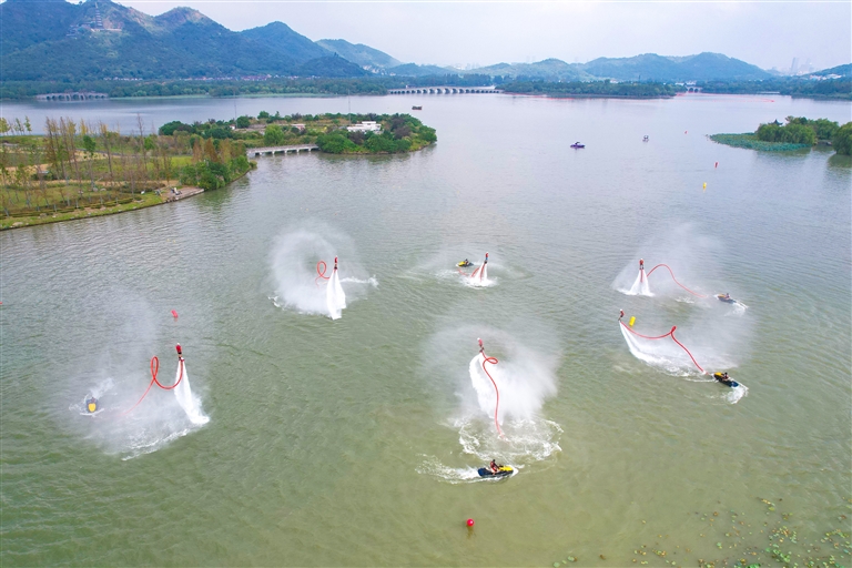 健儿们在碧波间腾跃翻转,与湘湖的自然风光交相辉映,为观众带来了一场视觉与动感兼具的湖上盛宴。
