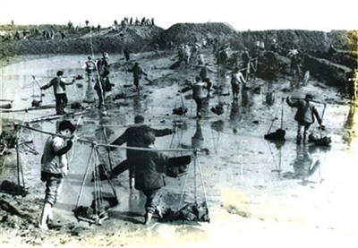 各就各位,动工筑堤。利民大队是一条很深的流化沟,有40多米长,30多米宽,歪流斜角,很有点桀骜不驯的样子,许多人没见过,不免有点发怵,感到难以下手。大队长王元水负责现场,他懂得大家的心思,提高嗓门说:“大家不要‘看呆瞪’(不动),站着看看流化沟是不会动的,全部赤脚,各队长马上组织起来,带粪桶的挑水,带铁耙与土箕扁担的找好搭班,找高一点地方马上动,做起来再说。”八队党员徐正林脱下外衣外裤,卷起裤脚,挑起粪桶就挑水,团员蒋长兴随即也跳进沟中央舀起一担水往外挑去……社员们干起来了。