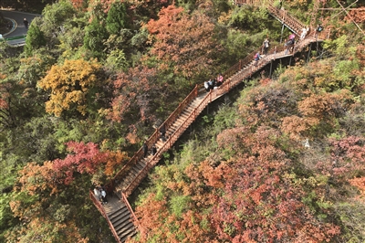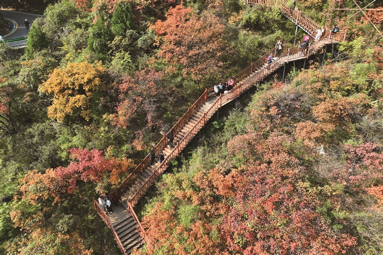 图为11月2日,游客在河南省沁阳市神农山景区赏红叶。