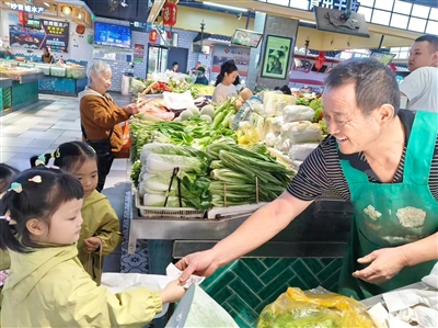 活动当天,在老师的全程护送下,中班的孩子攥着零钱包,对照清单仔细采购。有的孩子蹲在蔬菜摊前辨认胡萝卜,有的孩子踮脚挑选西红柿,还有的孩子认真数着硬币付款。萌娃们专注的模样为热闹的菜场增添了别样童趣。“让孩子认识食材的来源,是生活教育的重要起点。”带队老师笑着说。