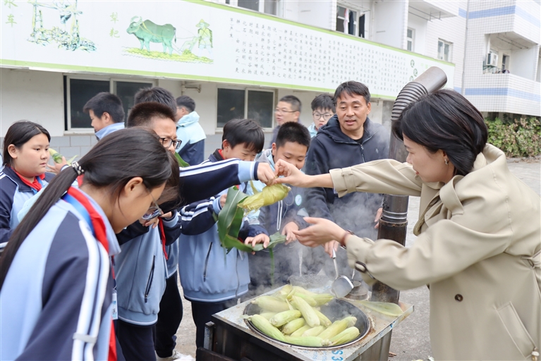 更让同学们惊喜的是,郭校长不仅全程参与劳动,还亲自架锅煮玉米,并将热气腾腾的玉米一一递到同学们手中。“校长给我们发的玉米,特别香、特别甜!”一位同学兴奋地说。“智慧农场是学校‘生活即教育’理念的生动实践,希望同学们通过丰收节,真正理解劳动的价值,学会感恩自然、珍惜食物。”看着学生们满足的模样,郭校长十分欣慰。