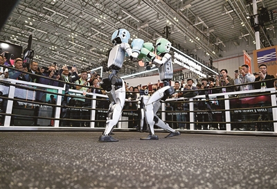 11月6日,在第八届进博会技术装备展区宇树科技展台,两台G1人形机器人的格斗表演吸引了众多观众。它们戴着护具及拳套,施展直拳、勾拳、左右鞭腿,展示倒地自主起身等复杂动作,不时赢得观众喝彩。据介绍,这款亮相表演的人形机器人身高132厘米,体重约35公斤。